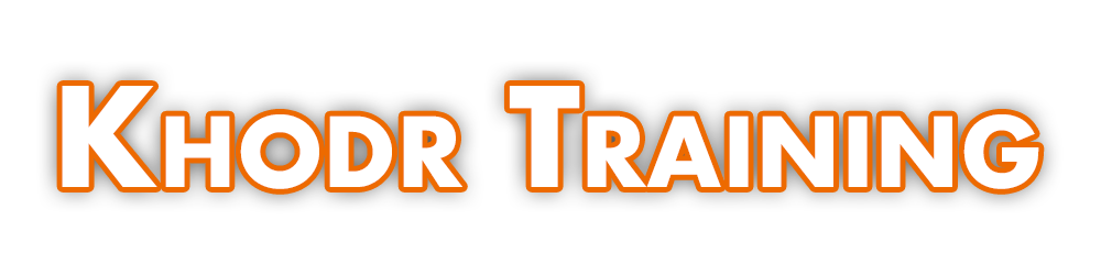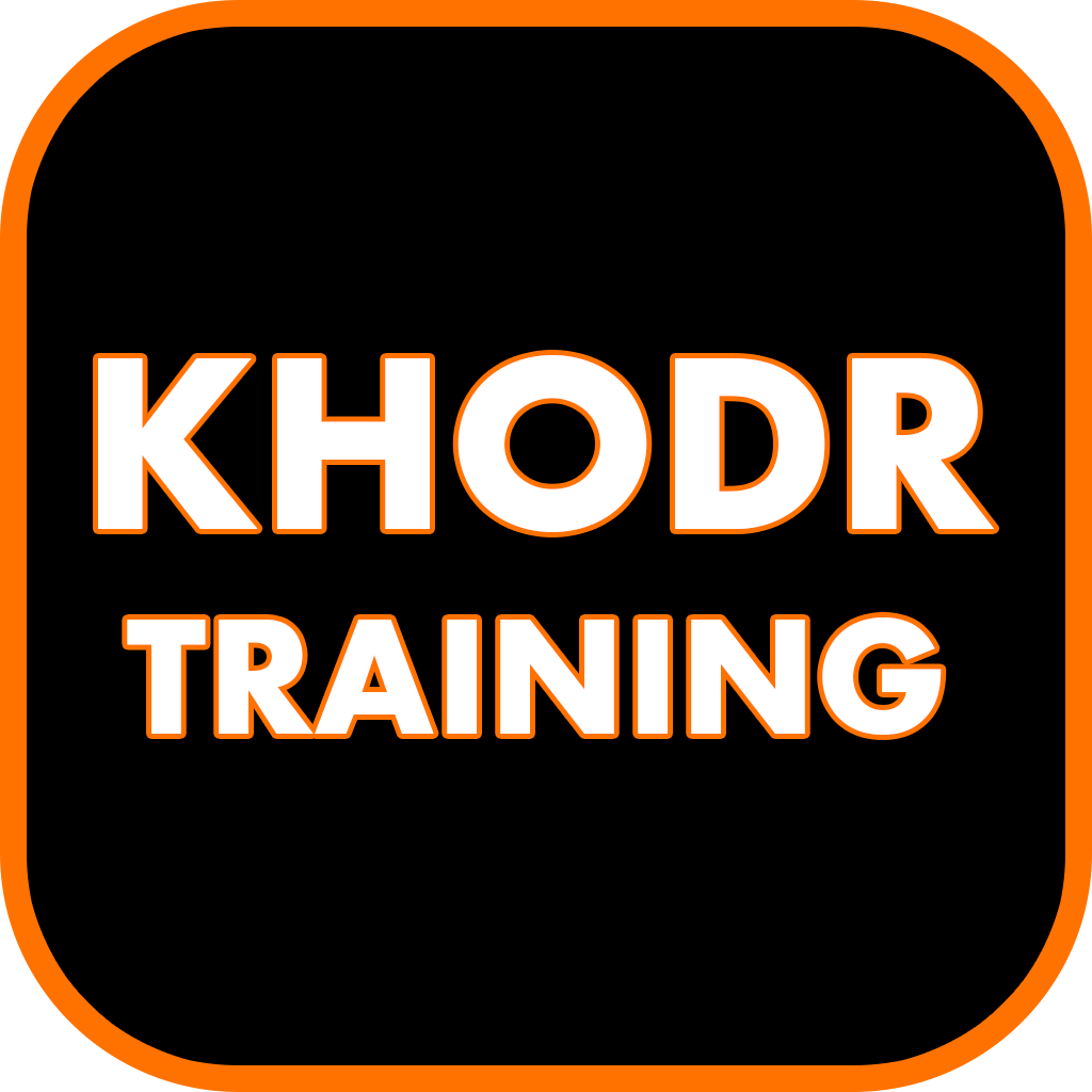 Khodr Training logo with black background, orange border, white text outlined in orange.